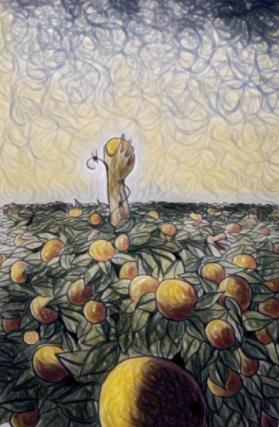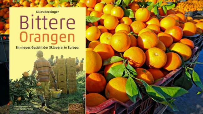 Ein Teil der Ausstellung „Hear my voice“ gibt die Situation der Arbeiter auf den Orangenplantagen wieder. Mit Zeichnungen und Texten (englisch). Die Ausstellung wurde unter anderem von Mediterranean Hope und den Evangelischen Kirchen in Italien erstellt. Hier ein Einblick.